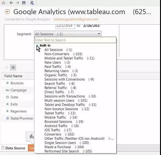 本例中我们将使用自定义的度量组合,选择分析数据后,我们最后可以选择用于筛选数据的特定分段,此菜单类似于添加纬度和度量下拉菜单,但在我们只想检查网站的特定部分的情况下,数据源整体筛选器的作用,默认情况下分段将被设置为全部会话数。