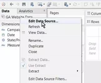 数据提取可被视为在特定提取时刻拍的数据库快照,如果我们希望添加纬度或度量到分析中,可以右键单击数据窗格中的Goole Analytics连接。