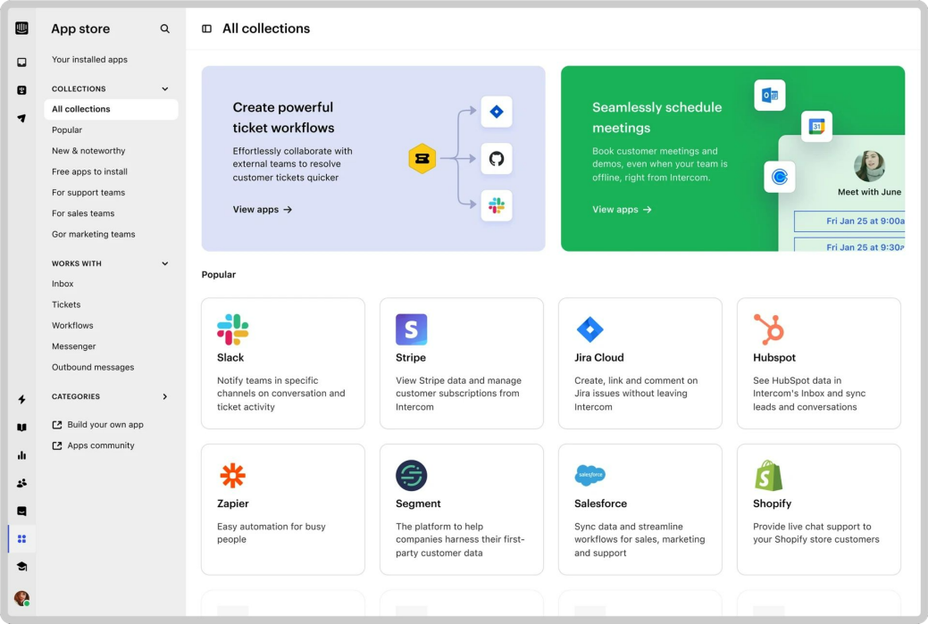 Intercom 可与 Salesforce、HubSpot、Slack、Zendesk、Stripe 等主流系统无缝集成,并支持开放 API,帮助企业灵活构建符合自身业务的客户运营生态。