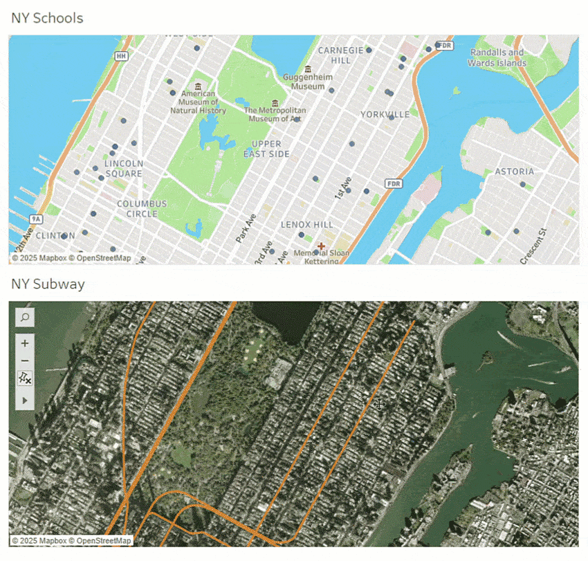 图:Tableau 内两个地图的动图展示,当一个视图范围发生变化时,另一个地图的数据也随之动态更新。