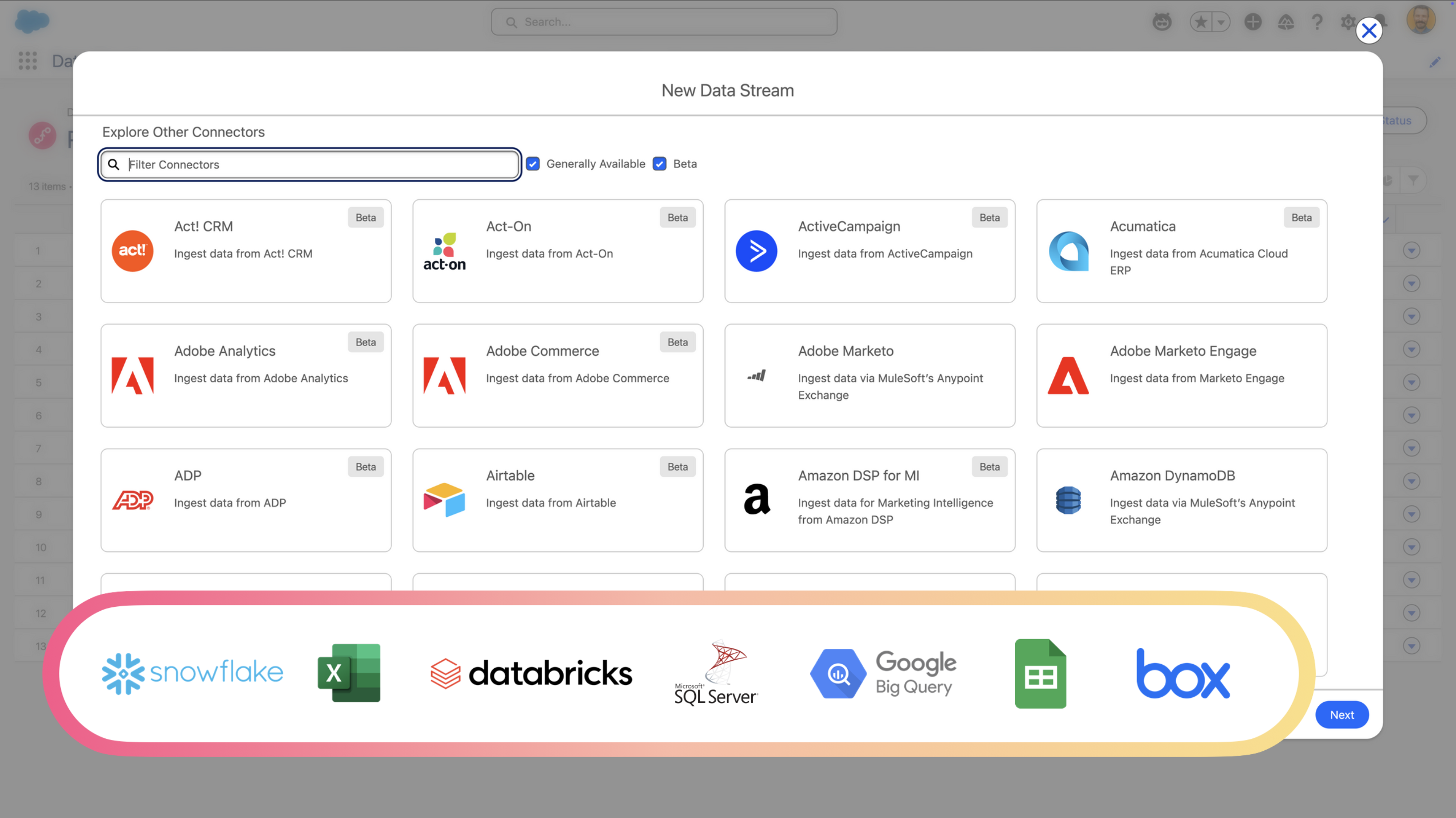 数据是分析的基础。借助 Data Cloud,你能轻松连接和统一数据,访问外部平台数据,如Snowflake、Databricks、Google BigQuery 和亚马逊云 Redshift,无需数据复制即可实现快速访问和安全传输,大幅减少存储成本。