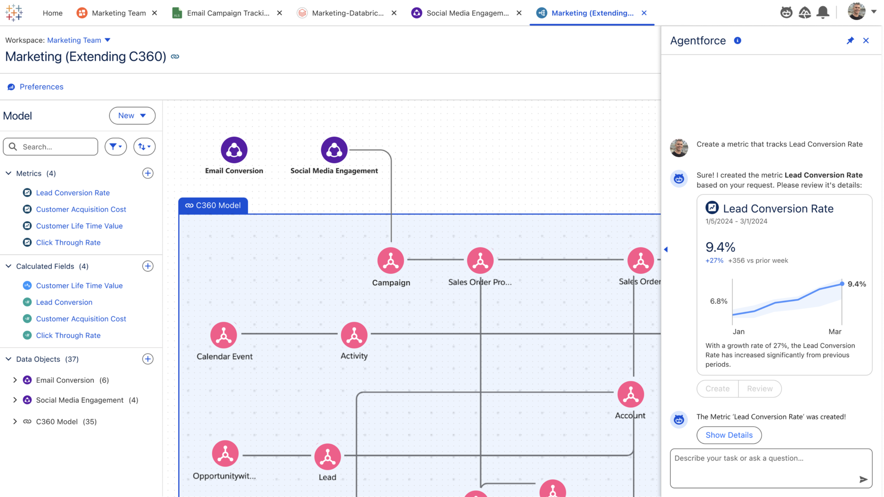 图:Tableau Semantics 界面,展示治理模型及与 Agentforce 交互,创建新度量指标