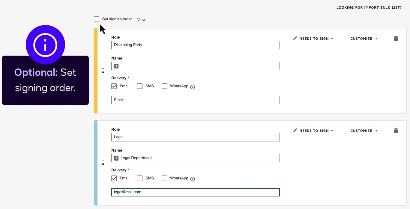 添加收件人角色及指定收件人。若要批量添加收件人列表,可选择 “导入批量列表” 选项,再依照 “使用批量发送功能发送文档” 步骤进行。