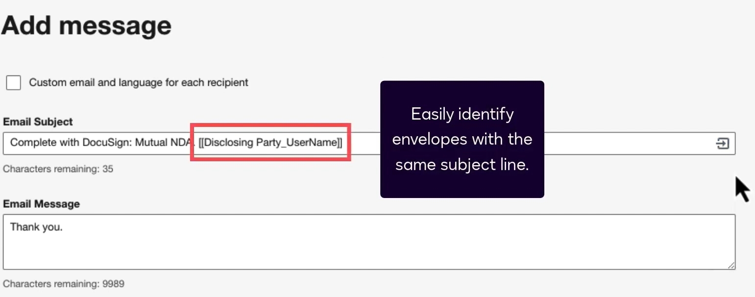 你可以在模板中自定义电子邮件的主题和消息内容,使用可选的合并字段功能。这样一来,带有相同主题行的信封就能轻松识别了。