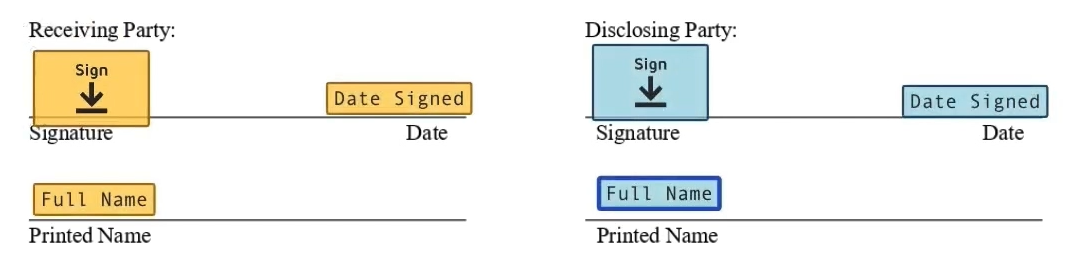 如果要设置文档签名字段,选择 “下一步”,并为每个模板收件人添加签名字段(如接收方、披露方、签名、签署日期、打印体姓名等),最后选择 “保存并关闭” 完成模板创建。
