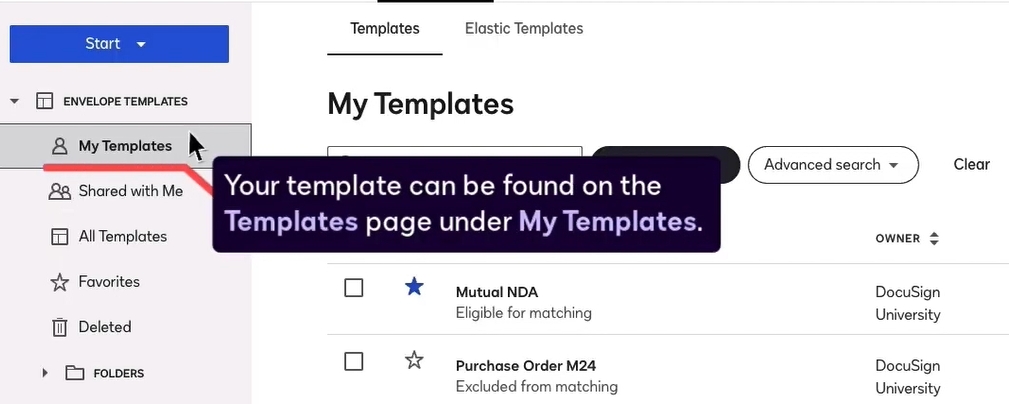 在 Docusign 账户的 “模板” 页面中,依次选择 “开始”>“信封模板”>“创建模板”。