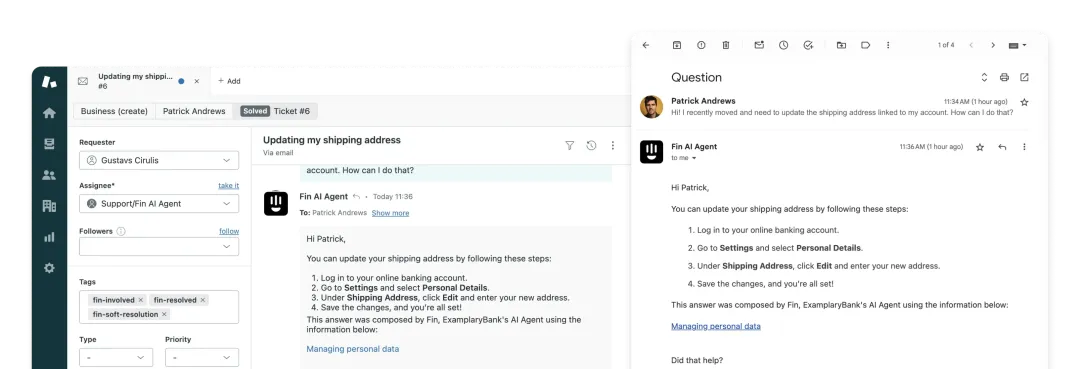 Fin 的能力不止于此。无论是电子邮件、联系表单,还是其他服务渠道,它都能与 Zendesk 工作区深度融合。客服人员无需切换界面,即可在统一平台上查看 Fin 处理进度、补充解答或直接接手案例,实现全渠道服务的无缝衔接。