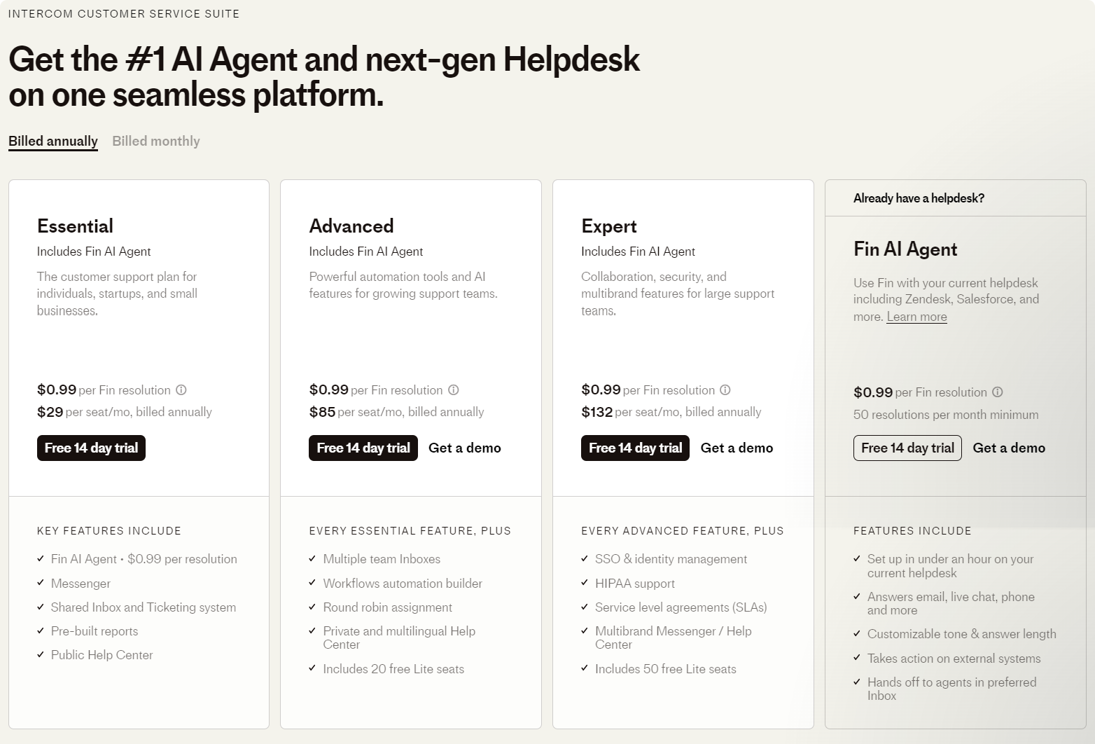 目前,Intercom 提供三大客户服务套件,涵盖 Essential、Advanced 和 Expert 三个等级,区别主要在功能深度、自动化能力及企业级支持,适合不同规模和阶段的企业。