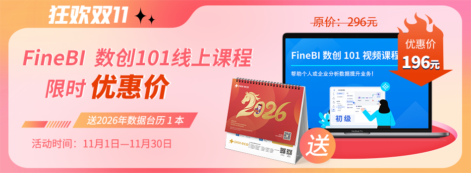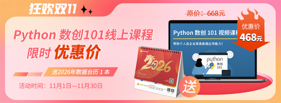 11.1-11.30,任意购买一款数创 101 视频课程,即享专属优惠与实用赠品!想一次性摸透多门数据工具?现在正是最好的时机!