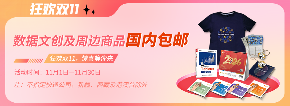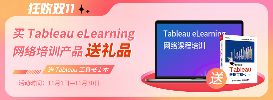11.1-11.30,购买 Tableau eLearning 课程或工具书配套视频都可享受限时优惠,且每单加送 Tableau 工具书一本,组合出击,闭环提升,买到即赚到!