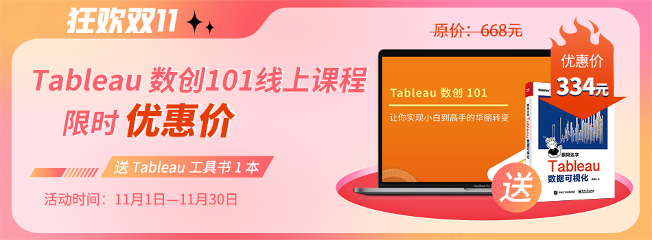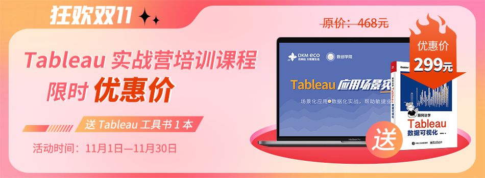 11.1-11.30 期间,Tableau 实战营培训课程账号限时 299 元(原价 468 元),下单即送 Tableau 工具书一本。热销爆款,机不可失,快把进阶机会收入囊中!