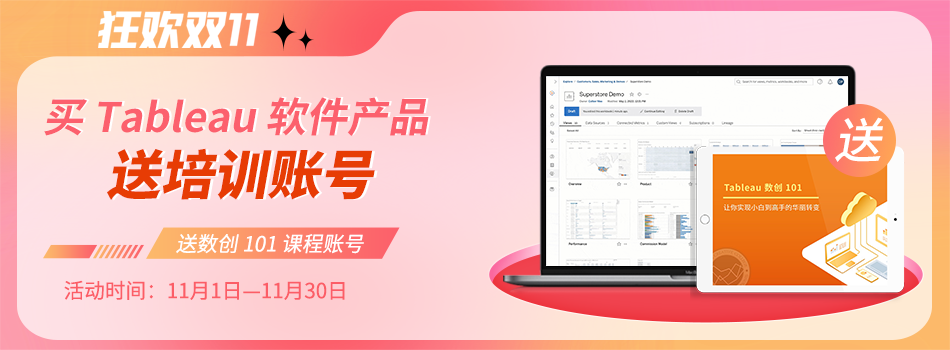11.1-11.30,凡新购 Tableau 软件产品,即赠送「数创 101:Tableau Desktop 培训」课程账号,帮你从新手进阶到高阶分析师,轻松开启数据进阶新篇章。