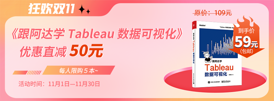 11.1-11.30,购买《跟阿达学 Tableau 数据可视化》工具书,只需 59 元!虽然每人限购 5 本,但如果是企业团购,就不用担心邮费啦~简直是个人与团队学习的最佳机遇!