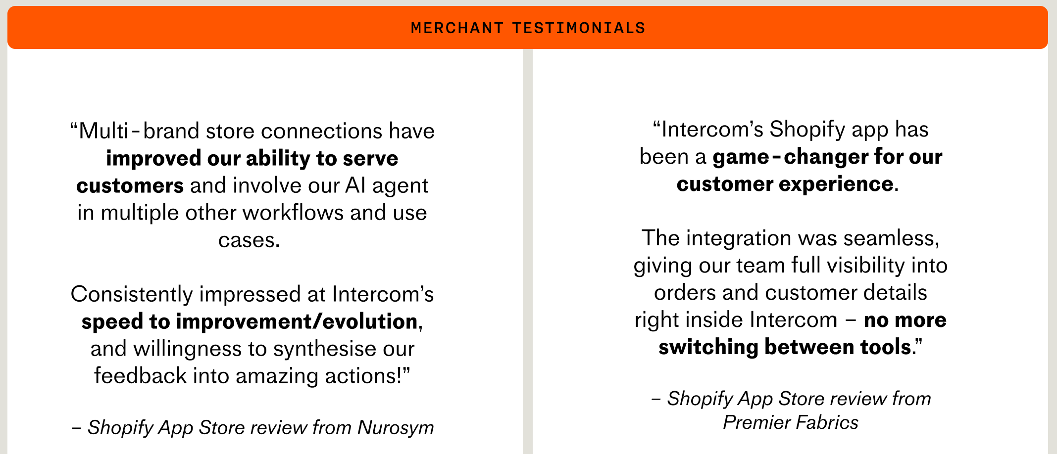 这些反馈显示,通过 Intercom 与 Shopify 的深度整合,商家能够在单一平台上高效管理多店铺订单、优化客户互动,并提升整体运营效率。