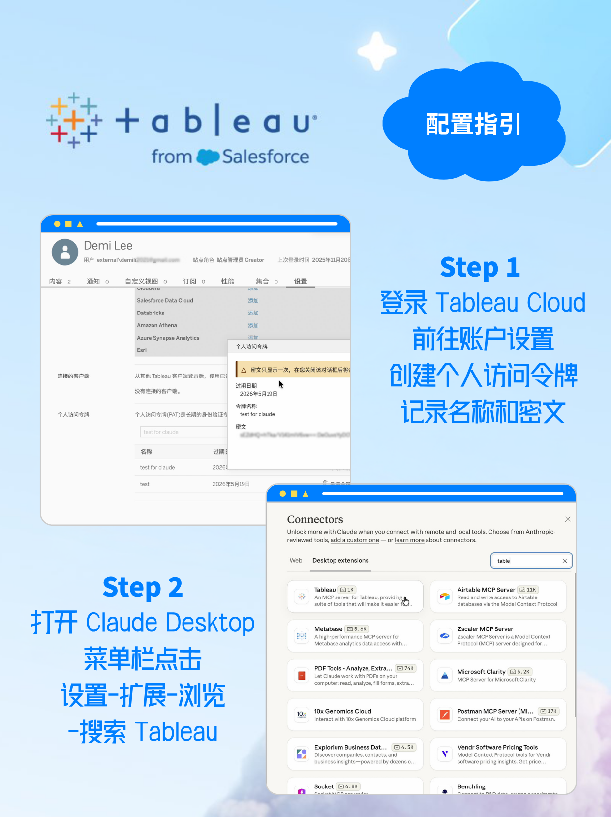 1️⃣ 须拥有 Tableau Cloud 或 Server 的有效账号,包括能登录、访问数据源、管理个人访问令牌等基本权限。