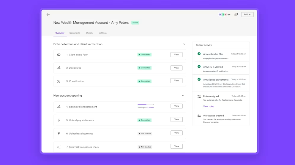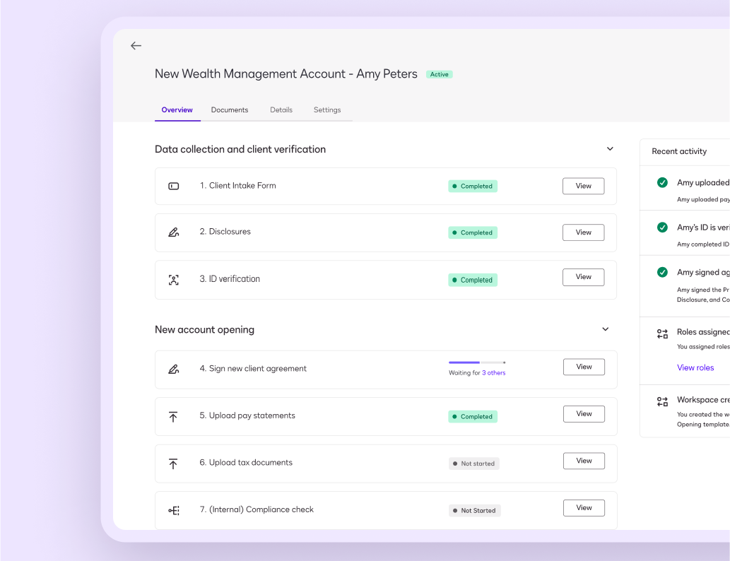 在金融服务领域,Workspaces 帮助团队从繁琐的表格收集和授权验证中解放出来。无论是财富管理顾问为客户开设新账户,还是贷款专员处理房屋贷款所需的大量证明材料,所有文件都能在同一个平台高效管理,减少延迟,加速审批。