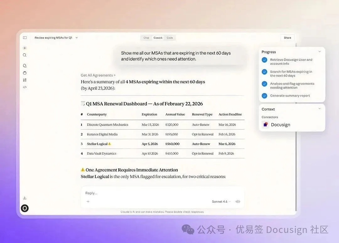 通过 Docusign 与 Claude Cowork 的连接器,AI 不再局限于“建议者”,而成为“执行者”。