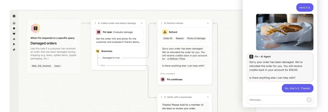 Fin Tasks 将生成式 AI 的灵活性与规则化流程的可靠性结合。企业只需用自然语言描述任务要求,Fin 就能自动构建完整工作流程,并确保每个步骤符合业务规则。无论是退款、身份验证还是预约调整等,Fin 都能在高效处理的同时保持一致性和可靠性。