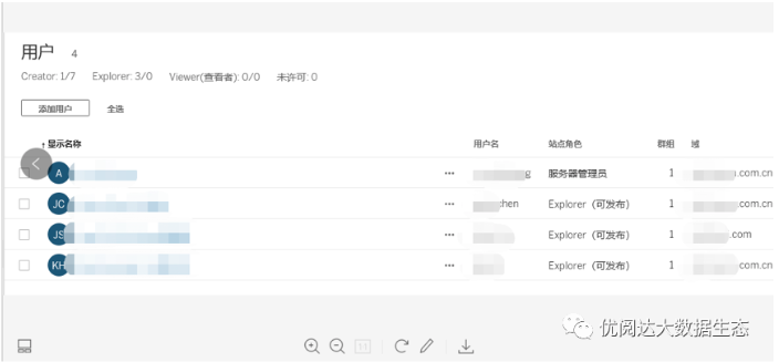 Tableau server所在的域即安装时候用的域的用户,直接输入主域(domain1)中的用户名即可导入,要导入另外一个域的用户的时候,输入辅助域名\用户名这样的格式即成功导入第二个域中的用户,导入后可以看到两个域中的信息以及对应的用户。