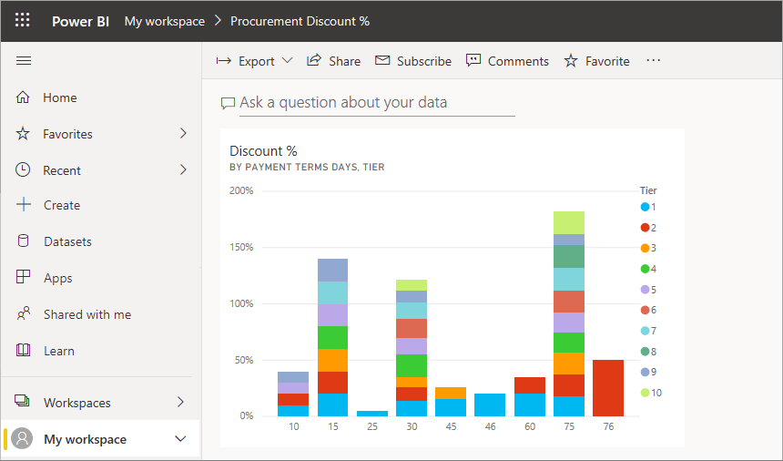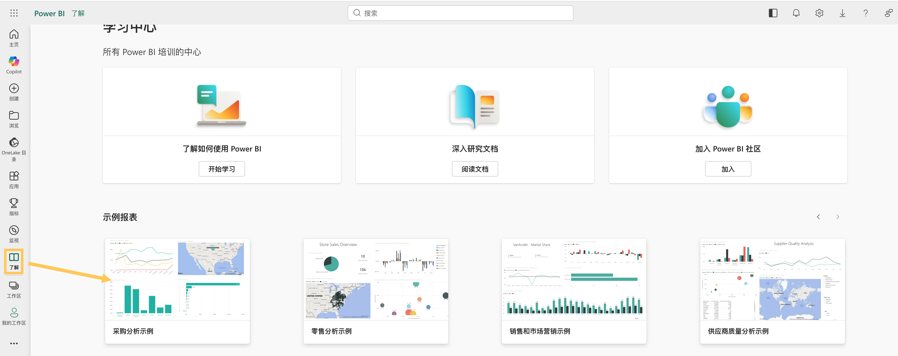 在 Power BI 服务中,可通过以下步骤并基于采购分析示例 ,将可视化效果固定到新仪表板。
