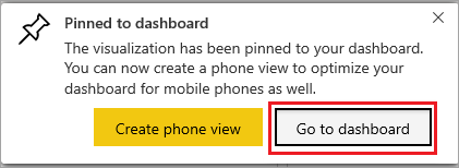 当你选择“固定” 时,Power BI 将在当前工作区中创建新仪表板。 在“已固定到仪表板” 消息出现之后,选择“转到仪表板” 。 如果系统提示你保存报表,请选择“保存”。