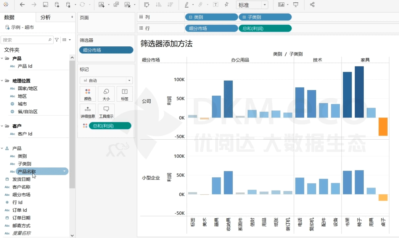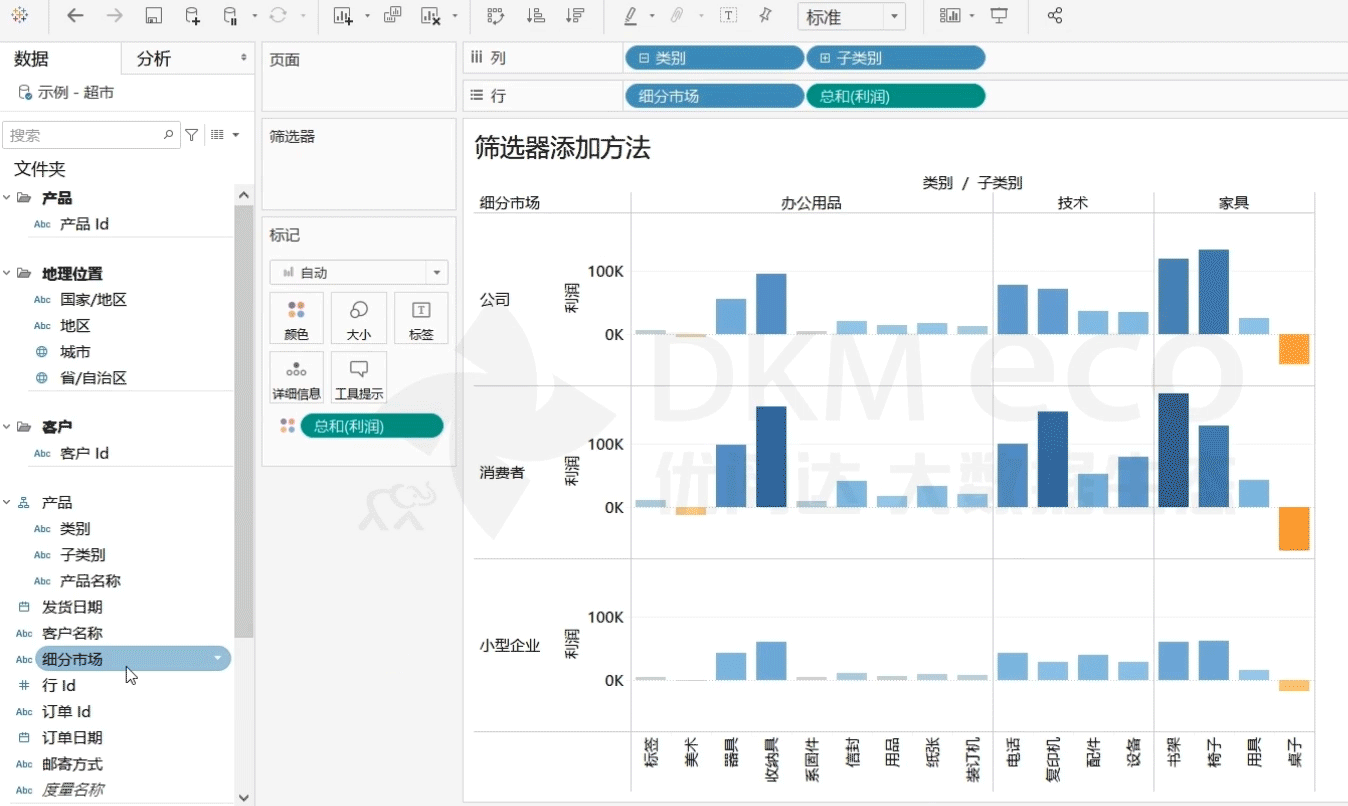 这里,我们只想查看公司和小型企业的利润市场分布,因此可以只勾选公司、小型企业;或者也可以只勾选消费者,再点击“排除”。然后,再点击“确定”按钮。这两种方式都是对细分市场的筛选。