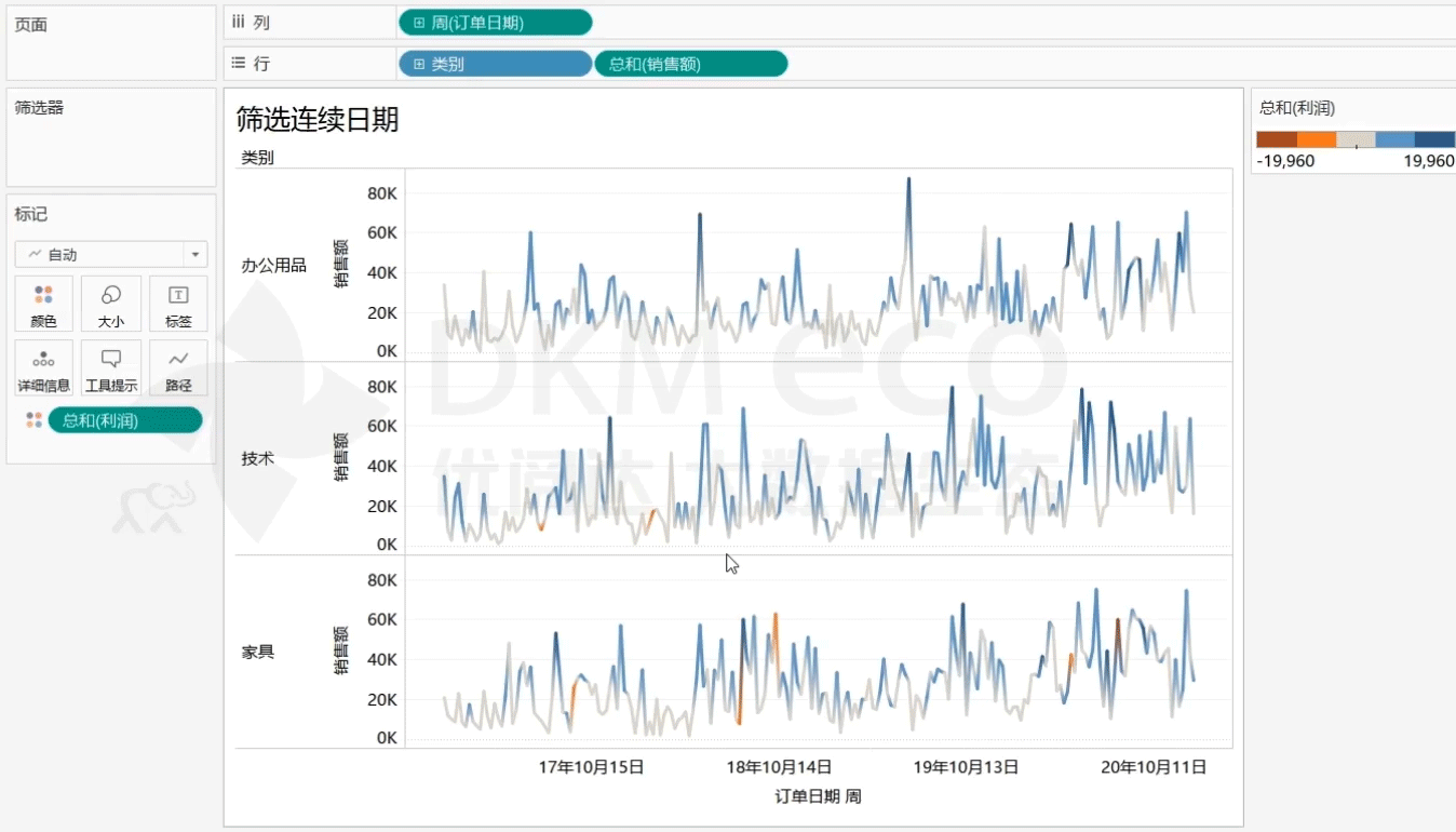 示例视图中显示的是华东地区产品订单的利润情况。我们看到,利润大约在-7978元到9808元的范围内变化。