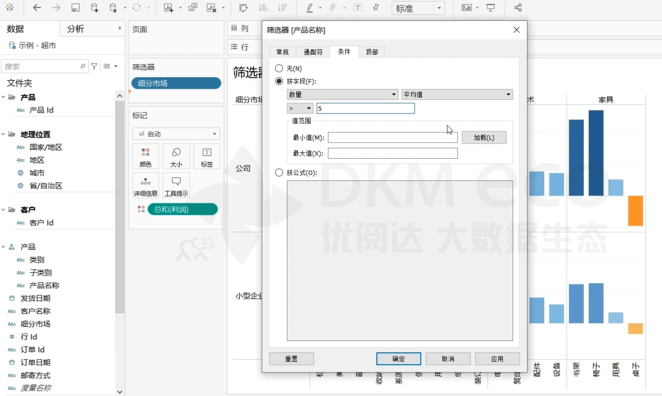在左侧“数据”窗格中,将维度“产品名称”拖入“筛选器”功能区。在弹出的筛选器对话框中,我们点击“条件”选项卡,将字段选择为“数量“,聚合方式选择为“平均值”,比较方式选择为“大于”,然后输入“5”。