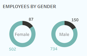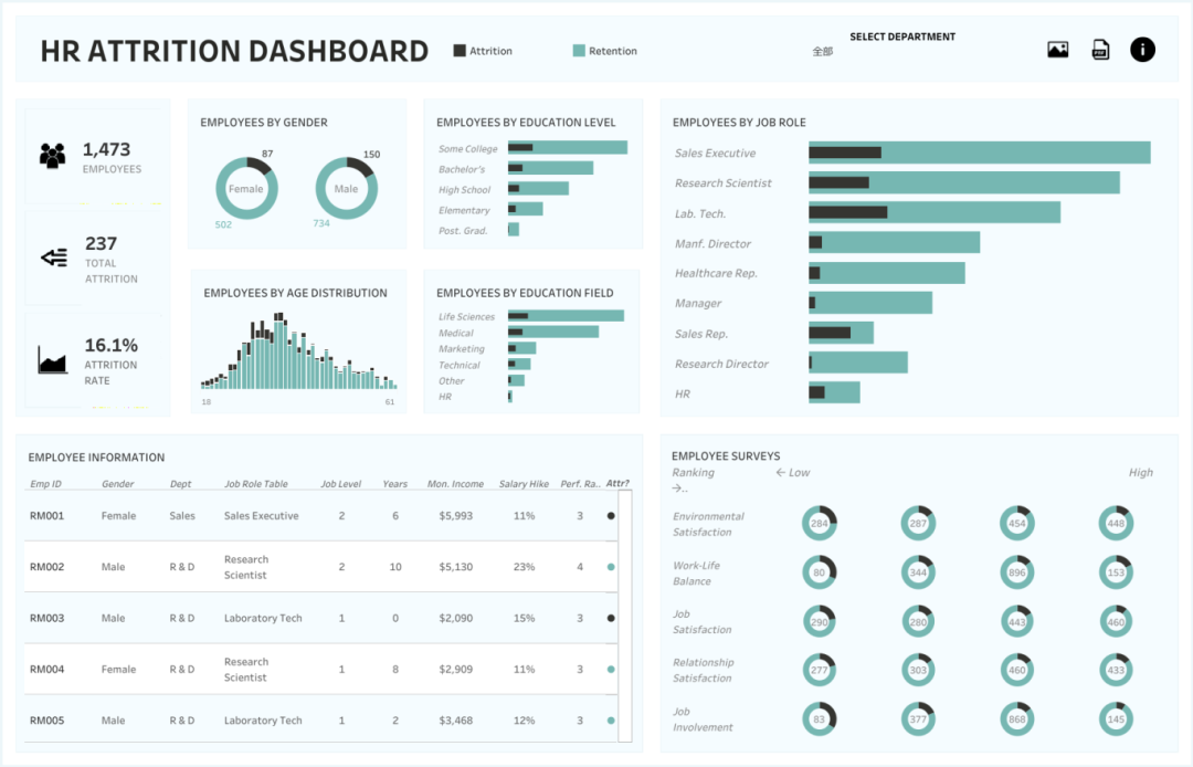 以两个环形图展示男女员工人数及离职人数(Retention/Attrition)。从图表上可以看出男性员工人数(734)略多于女性(502),而离职的比例也相对接近。这种维度分析有助于企业判断是否存在性别差异导致的员工流失问题。