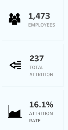 这里展示了员工总数(1,473)、离职总数(237)以及离职率(16.1%)。通过简洁的 KPI 卡片形式,管理层可以快速掌握企业整体的人力资源现状。这种设计的亮点是数据直观,突出了关键指标,有助于管理者迅速定位问题规模。