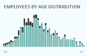 采用直方图展现了从 18 岁到 61 岁的员工分布情况,同时叠加离职情况。数据表明,30 岁左右的员工群体最多,且该年龄段的离职人数也较为集中。这种展示方式能帮助 HR 发现流失的年龄结构特征,从而制定更有针对性的保留策略(例如加强职业发展机会或福利措施)。