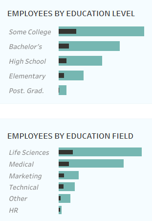 教育领域分布:用嵌套条形图展现不同教育领域员工的保留与流失情况。如生命科学、医学、市场营销、技术类等。从图中可见,生命科学和医学领域的员工占比较高,同时也存在一定离职率。这为 HR 在招聘和培养计划中提供了参考。