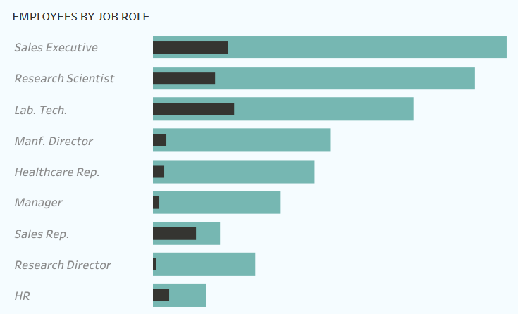 以嵌套条形图展示不同职位的在职与离职人数。可以明显看到,销售主管(Sales Executive)和研究科学家(Research Scientist)是人数最多且离职人数相对较高的岗位。这种分析帮助企业直观识别流失风险较大的岗位,进而优化岗位设计或改善工作环境。