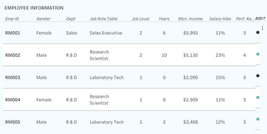 👉 在仪表板下方,展示了员工信息明细表。包括工号、性别、部门、职位、工作年限、收入、调薪幅度、绩效评分等维度。表格与上方图表联动,既能从整体宏观层面分析,也能深入到具体员工个体,形成“宏观+微观”的全景视角。