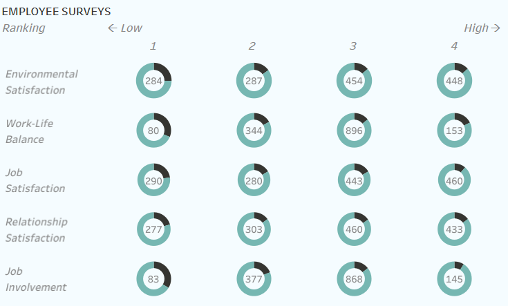 👉 最后看右下角的员工满意度调查结果。这里通过圆环图展示了五个维度:环境满意度、工作与生活平衡、工作满意度、关系满意度、工作投入度。每个维度都按照“低到高”分布人数。