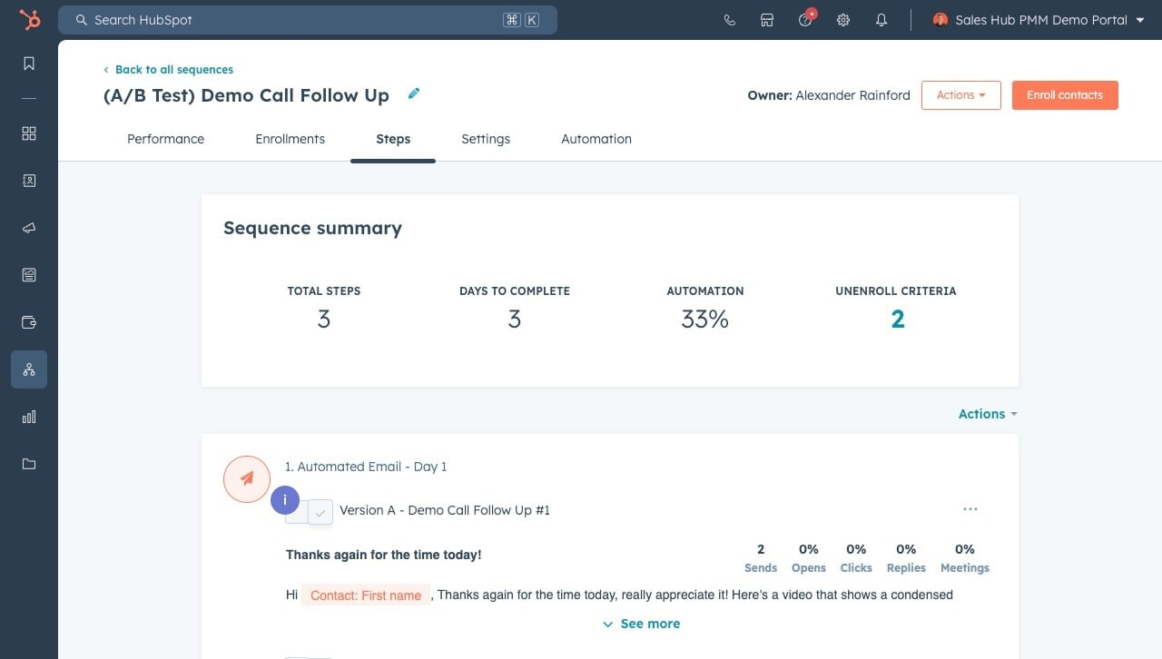 You can also run A/B tests directly within HubSpot to compare sequence strategies or email templates, with results auto-analyzed to help you continually improve.