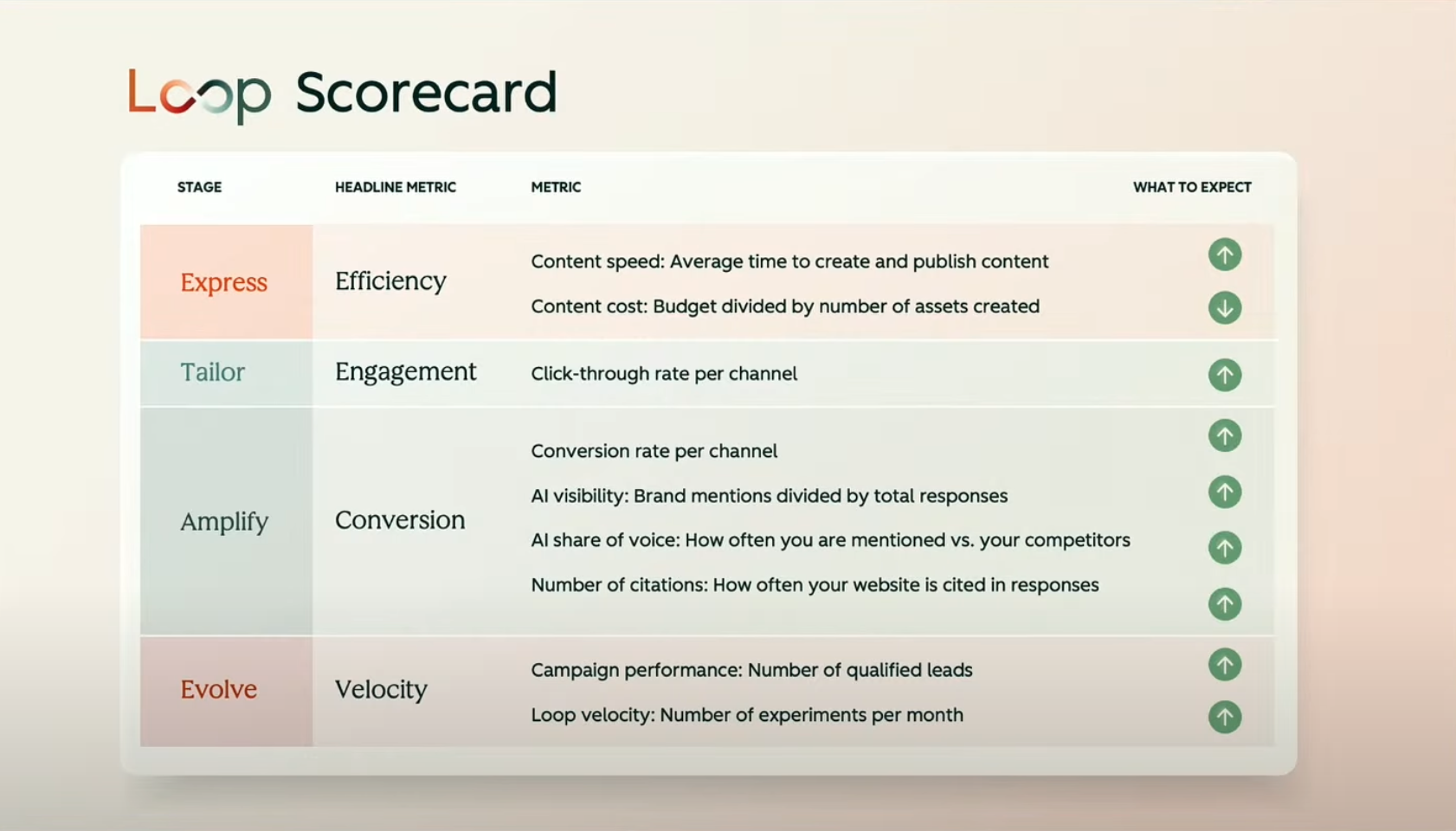 For example, Express: content speed and cost; Tailor: CTRs; Amplify: conversion rates, AI-driven exposure/mentions; Evolve: qualified leads and optimization frequency.