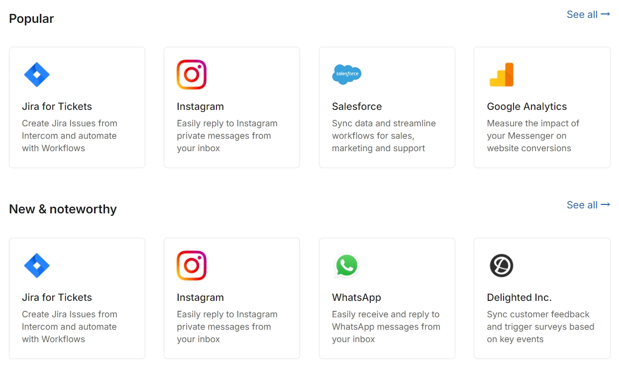 To meet the diverse business needs of enterprises, Intercom supports seamless integration with more than 450 applications, including major platforms such as Salesforce, Facebook, WhatsApp, HubSpot, and Zendesk. This powerful integration capability helps companies break down data silos, enabling seamless circulation of customer information, conversation records, and business data. As a result, team collaboration efficiency and customer experience improve significantly, while providing enterprises with more comprehensive data insights.