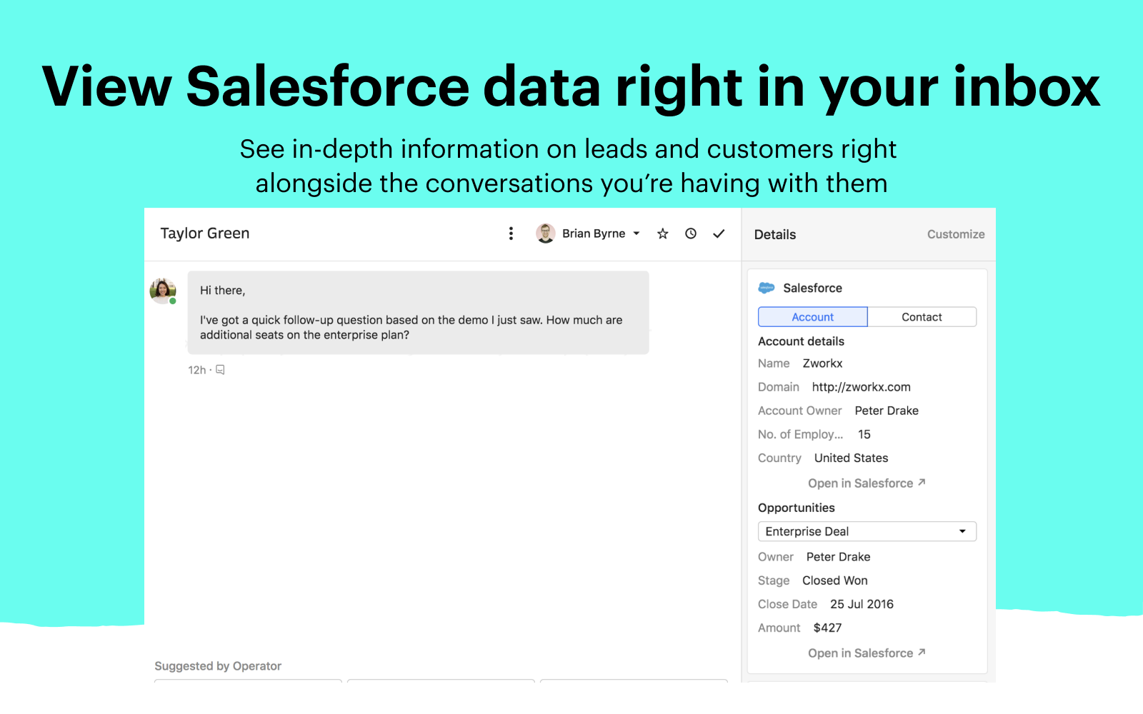 - View Salesforce data directly within the Intercom Inbox, minimizing the need to switch between apps — including lead status, owner, key contacts, contact details, opportunity stage and value, and expected close date.