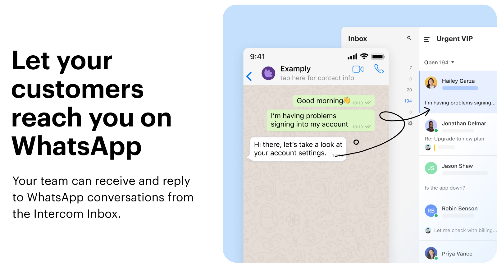 - Your team can manage WhatsApp conversations efficiently within Intercom using familiar workflows and tools.