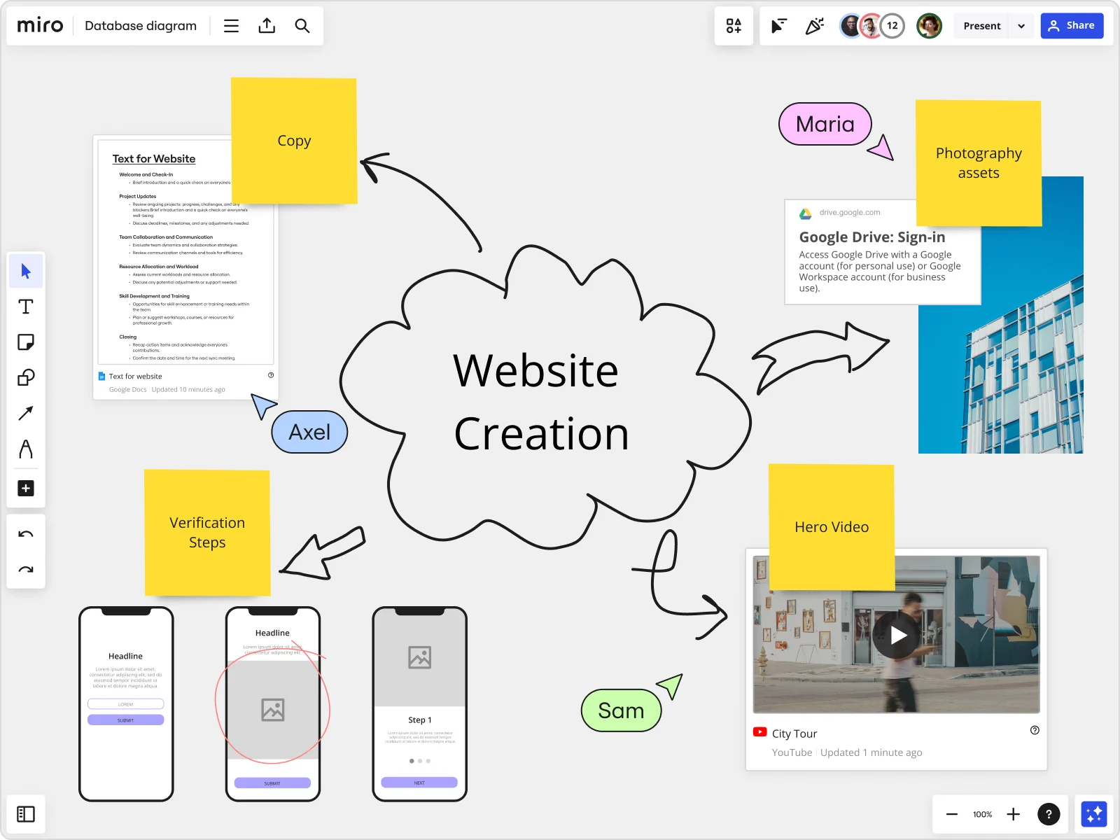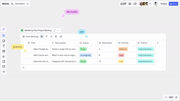 Miro allows you to host remote meetings and real-time presentations directly on the whiteboard, seamlessly integrating visual collaboration with voice communication: