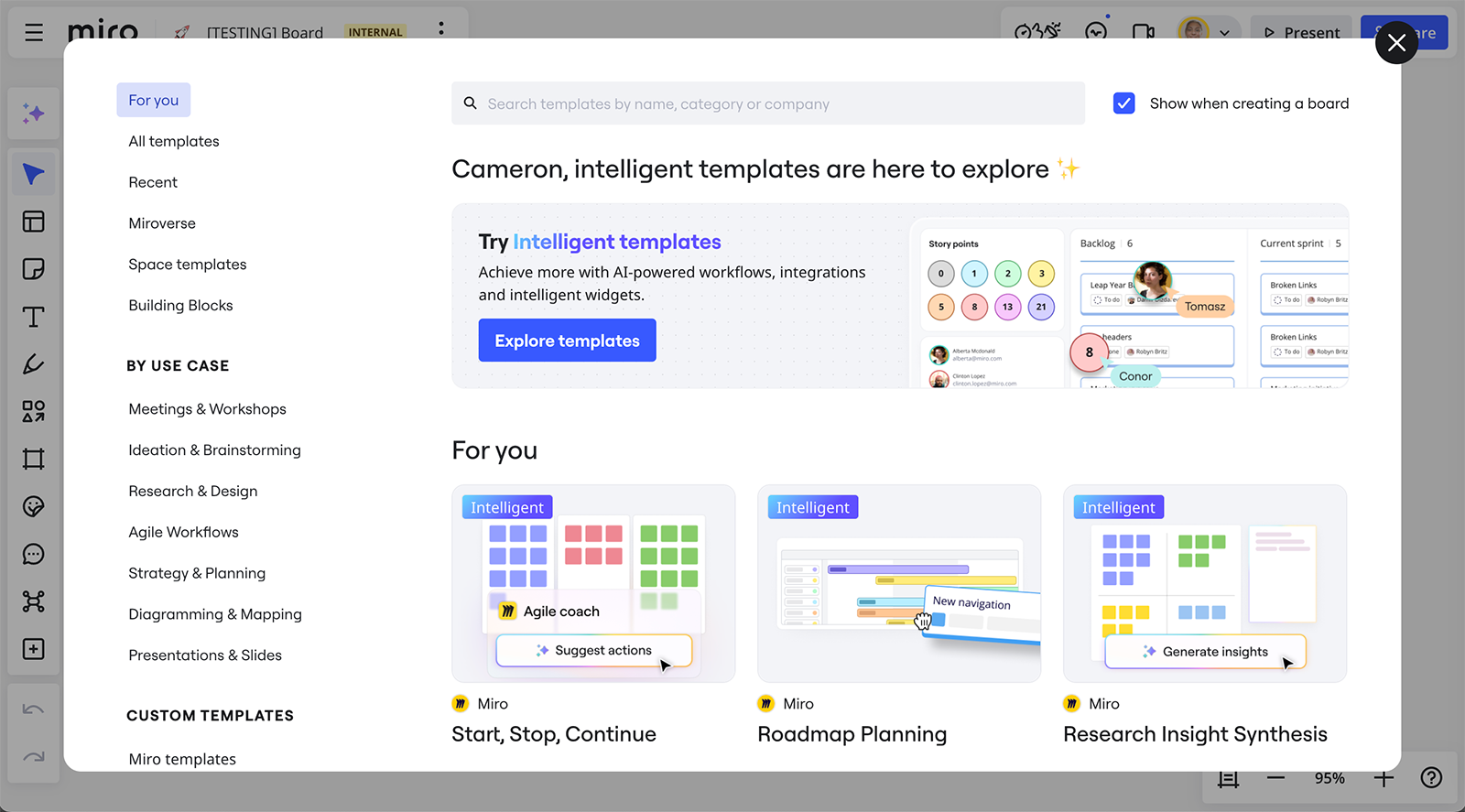 Don’t start from scratch. Miro offers a massive library of templates, covering the entire collaborative process from brainstorming to retrospectives: