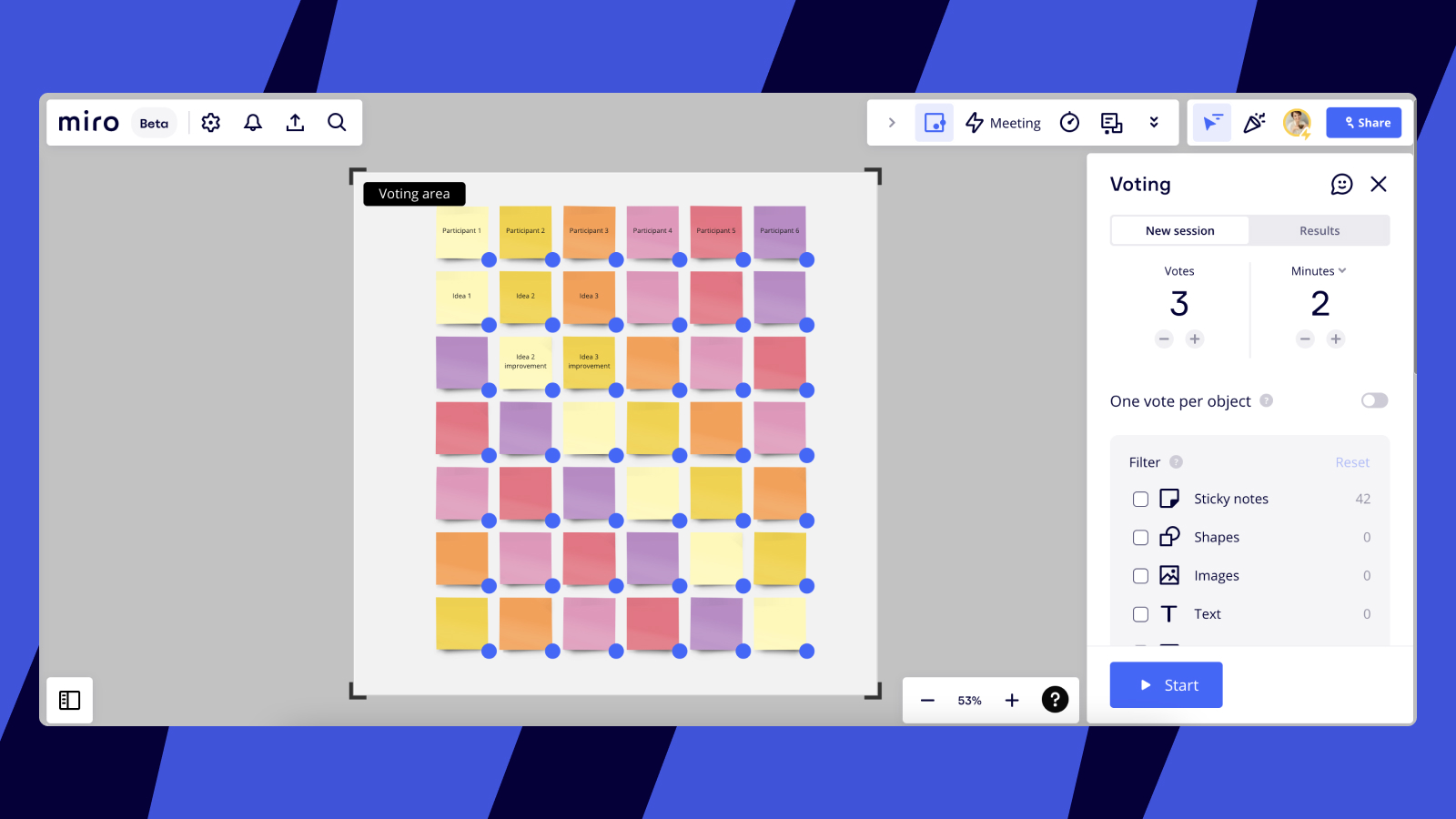 Whether you’re presenting a product pitch or conducting a quarterly review with leadership, the core goal of meetings remains the same: focus the discussion, ensure participation, and reach consensus. Miro’s suite of “meeting-centric” features will help you accomplish these tasks.