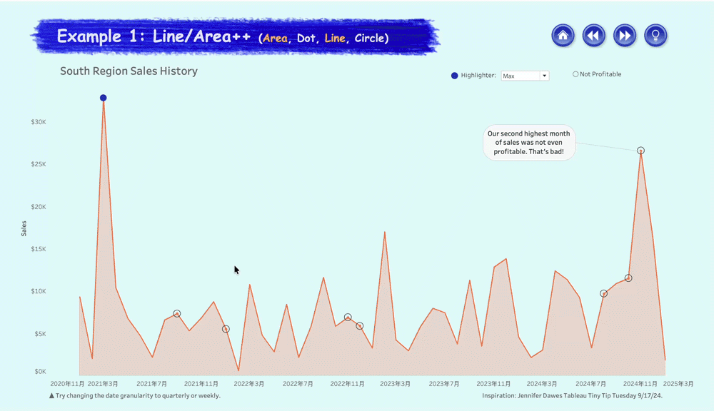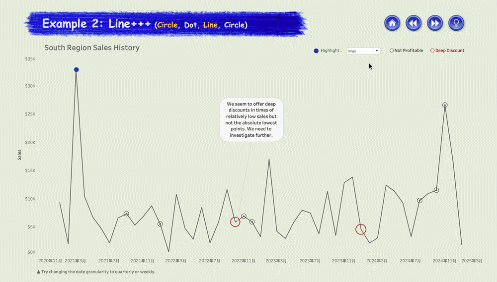 例如,最高销售额的月份用实心点特别高亮;出现“不盈利”情况的月份用空心圆圈做了区分;而一旦有“深度折扣”,则用红色圆圈醒目标记。这种方式让异常和业务动作(如大额让利)在趋势线中一目了然,非常便于管理和分析。