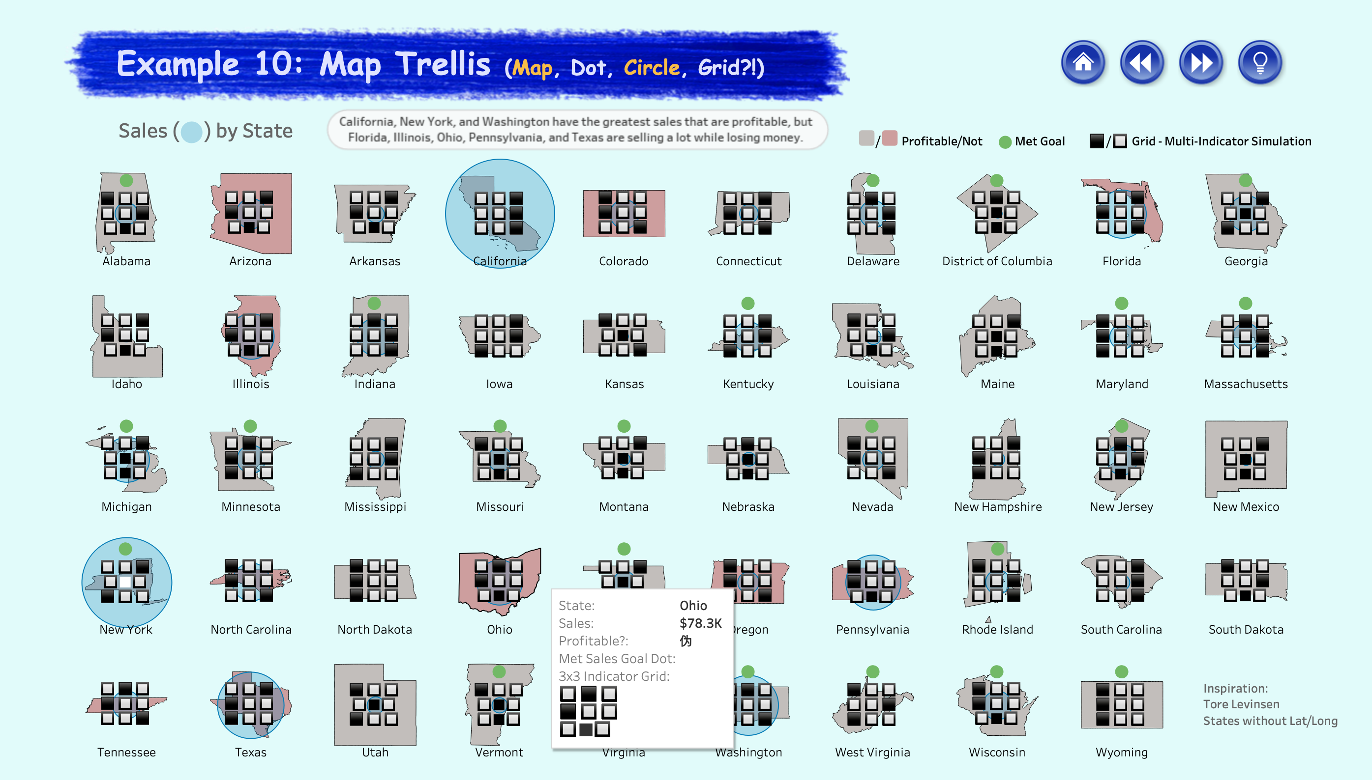 每个州的地图轮廓都嵌入了小型网格,网格用黑白和色块表示多种业务指标(如销售额、是否盈利、目标达成等),同时通过不同的方块、点或圆,模拟多指标联合分析;