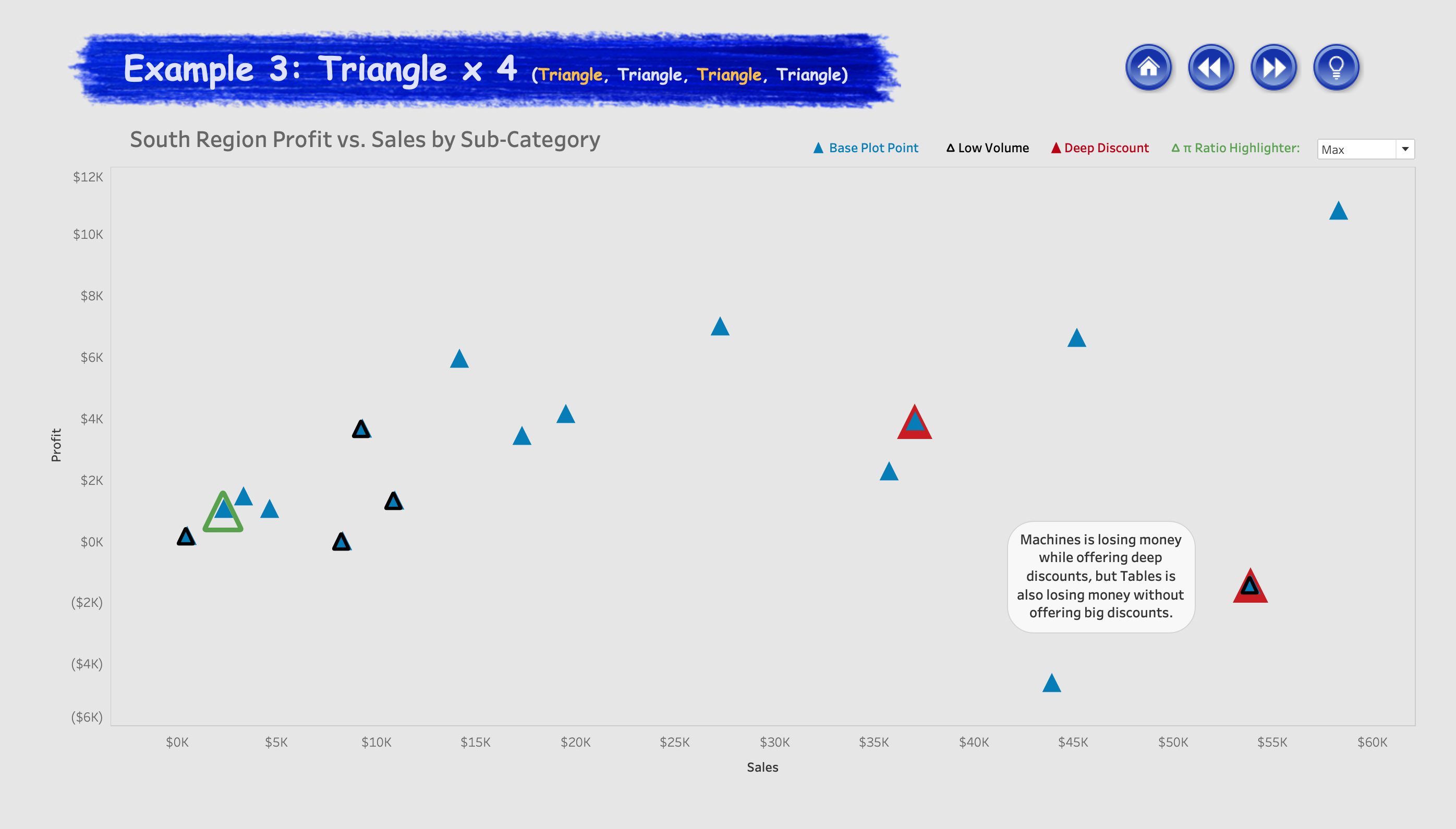 具体来看,每一个三角形既代表了一个子品类在“销售额-利润”坐标系中的位置,同时还通过颜色、大小和边框区分了不同状态,比如: