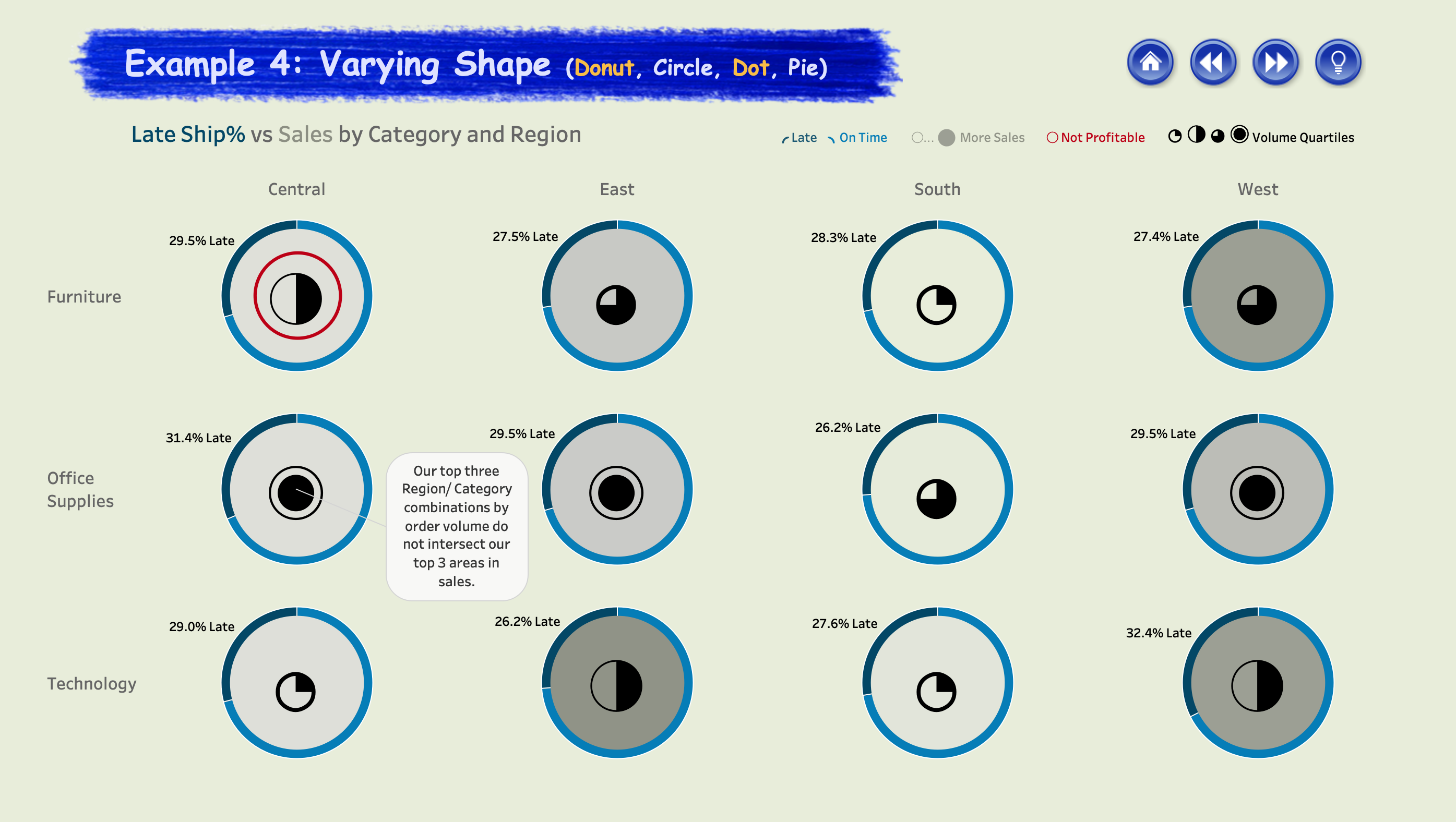 这种设计让每个细分图表都能浓缩呈现出该品类在不同地区的多项业务表现,比如“办公用品-中部”同时看到销售额、晚点比例、盈利情况等。还有个好处是,无需在多张图表之间切换,用户就能一屏掌握全局,把复杂的业务表现一览无余。