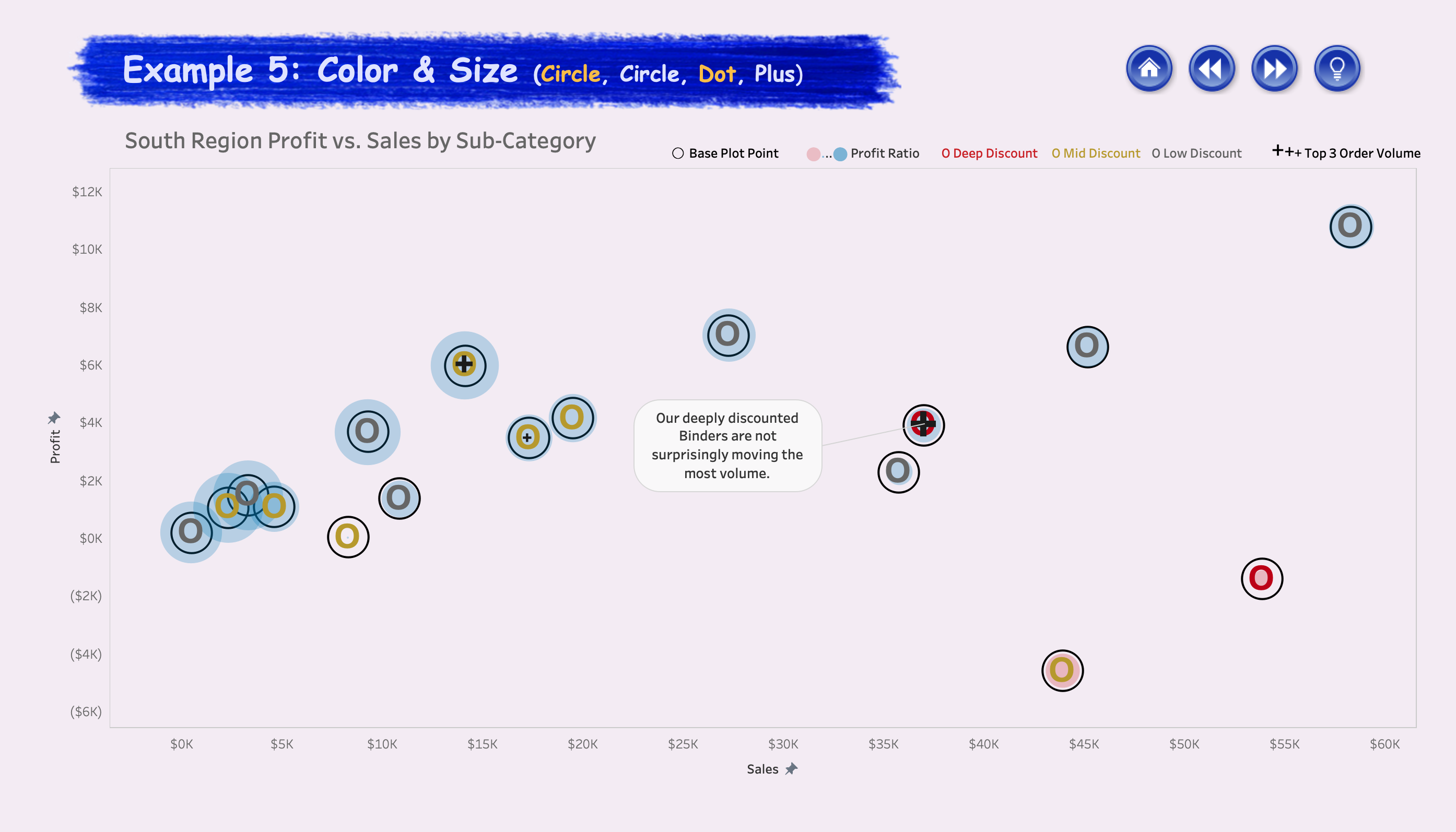 这样一来,简单的散点图就变成了业务全景图,用户可以同时捕捉到折扣策略、盈利能力、销量重点等多个业务信息点,无需多图切换。