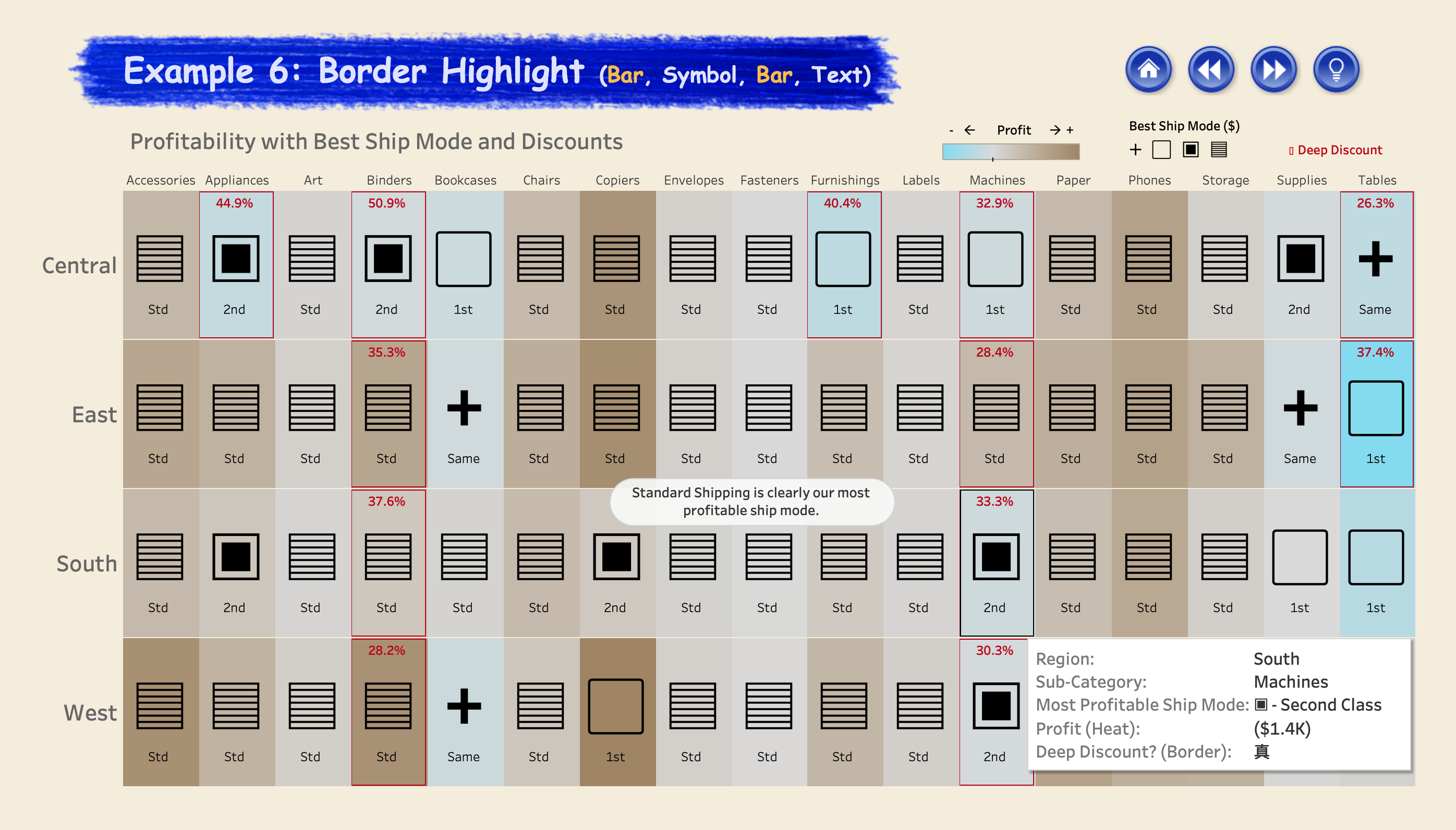 第六种方法是用“边框高亮”来帮助我们快速识别特殊业务现象。可以看到,整个表格用来比较不同地区、不同品类的最佳配送方式和折扣策略下的盈利能力: