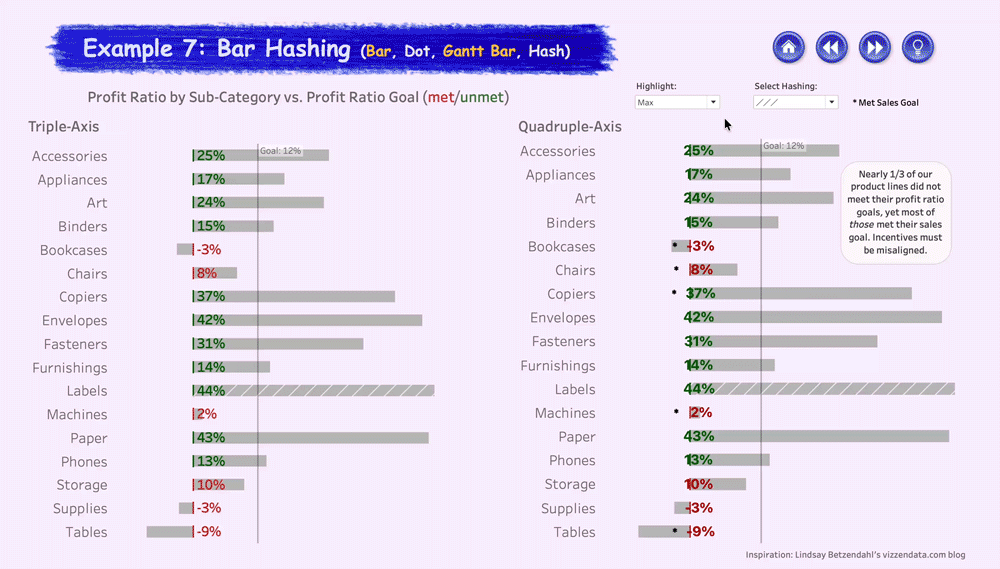 通过“条形填充/条纹纹理”,可以极大增强条形图的信息表达力。在这一示例中,不同的业务子品类一一排列,每一行不仅有利润率的条形图,还有“目标达成情况”:用颜色、斜线、星号等做特别标记。